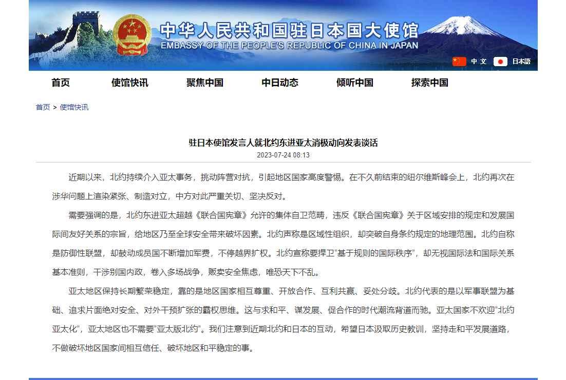 香港中通社7月24日電 中國駐日本大使館發言人當地時間22日就北約東進亞太消極動向發表談話。發言人表示,近期以來,北約持續介入亞太事務,挑動陣營對抗,引起地區國家高度警惕。