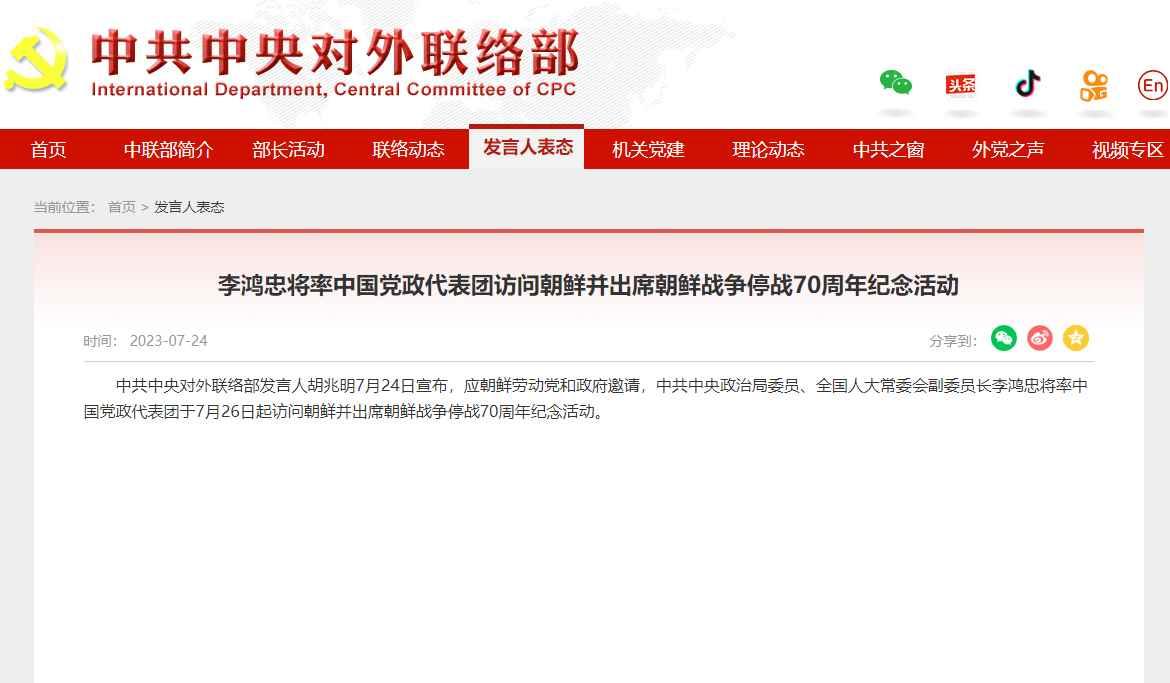 香港新聞網7月25日電 據中共中央對外聯絡部消息,中聯部發言人胡兆明7月24日宣佈,應朝鮮勞動黨和政府邀請,中共中央政治局委員、全國人大常委會副委員長李鴻忠將率中國黨政代表團於7月26日起訪問朝鮮並出席朝鮮戰爭停戰70周年紀念活動。