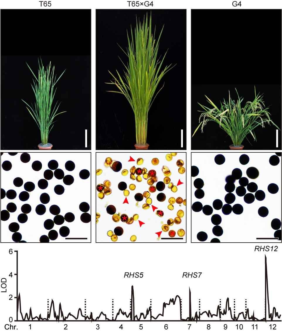 作物雜種優勢利用是大幅提高糧食產量的重要途徑。水稻分籼稻和粳稻兩個亞種,中國北方多種植粳稻,南方多種植籼稻。上世紀七十年代以來,袁隆平先生研發的雜交水稻主要是利用籼稻亞種內的雜種優勢,實現了水稻大幅增產,帶來第二次“綠色革命”,為中國乃至世界糧食安全做出了突出貢獻。一般來說,品種間親緣關係越遠,雜交優勢越明顯。如果籼稻和粳稻亞種間能育成超級雜交稻,據預測,可以比現有雜交水稻增產15%以上,因此如何利用亞種間的超強優勢一直受到育種家的關注。然而,籼稻和粳稻之間存在嚴重的生殖隔離,其雜交種常表現出雜種不育現象,是阻礙雜種優勢利用的最大障礙之一。本研究是繼自私基因(Science, 2018)之後,該團隊在雜種不育領域取得的又一突破性進展。 該研究團隊首先在全基因組層面分析鑒定了引起籼稻和粳稻雜種花粉不育的主效位點,然後對位於第12號染色體上的一個效應最大的位點進行了後續研究。遺傳分析發現該位點由緊密連鎖的兩個基因組成,可以分別比喻為“破壞者”和“守衛者”。“破壞者”對所有花粉產生傷害作用,引起花粉的敗育;而“守衛者”阻止“破壞者”的傷害作用,因此那些遺傳了該基因的花粉,因受到保護能正常發育。在世代繁衍過程中,當攜帶和不攜帶這對基因的水稻植株進行雜交時,在得到的雜交植株中,凡是不攜帶這對基因的花粉都不能正常發育,反之,凡是發育正常的花粉都攜帶這對基因,隨著世代的增加,含有該對基因的後代個體會逐漸增加,最終占主導地位,這種遺傳效應被稱之為“基因驅動”。
