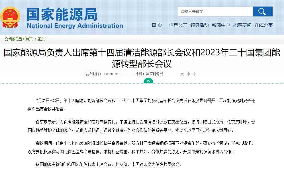 香港新聞網7月27日電 據國家能源局網站7月27日消息,7月21日-22日,第十四屆清潔能源部長會議和2023年二十國集團能源轉型部長會議先後在印度果阿召開。國家能源局副局長任京東出席會議並發言。