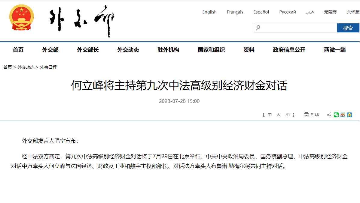 香港新聞網7月28日電 據中國外交部網站28日消息,外交部發言人毛寧宣佈:經中法雙方商定,第九次中法高級別經濟財金對話將於7月29日在北京舉行。中共中央政治局委員、國務院副總理、中法高級別經濟財金對話中方牽頭人何立峰與法國經濟、財政及工業和數字主權部部長、對話法方牽頭人佈魯諾·勒梅爾將共同主持對話。