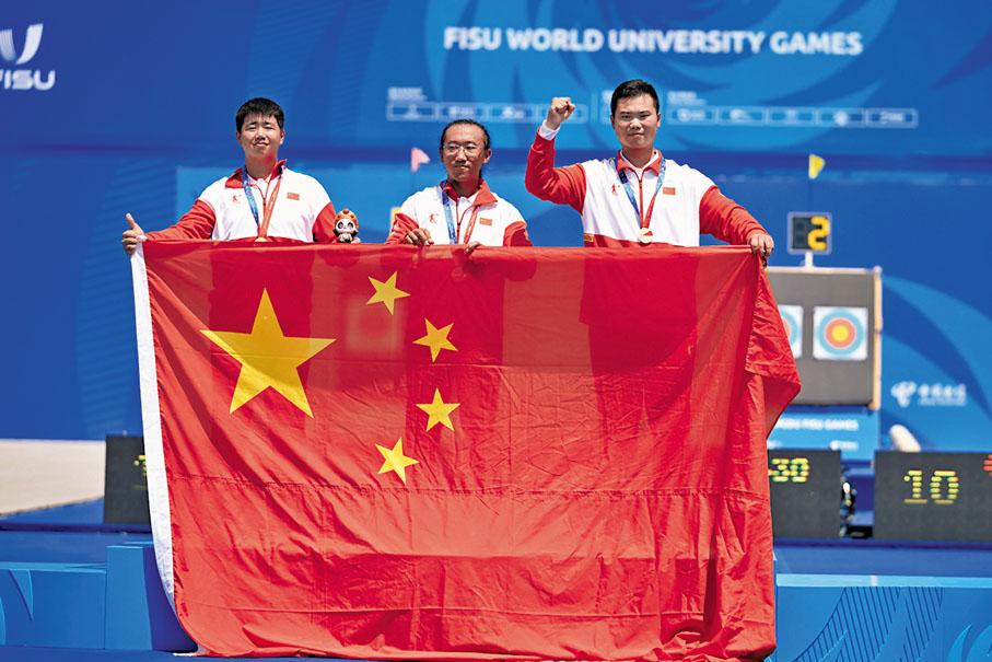 複合弓隊員(左至右)陳岩松、杜美余、王世坤在頒獎儀式上。 新華社 國家隊於周日(7月30日)射箭項目取得兩金,其中在男子複合弓團體決賽中,由杜美余、陳岩松、王世坤組成的團隊,戰勝法國隊奪得金牌,這也是中國射箭隊在本屆大運會收穫的首金。比賽開始後,國家隊首局比賽6支箭中前5箭均射出10環,奠定59:54的領先優勢。次局,國家隊展現出穩定性,以58:56再勝一局。隨後法國隊在第3局和第4局均射出57環,但國家隊眾將在這兩局同樣射出57環,最終以231:224獲勝。 另一射箭項目女子反曲弓團體決賽,國家隊由周丹琰、王黎敏 、李新鑫合作,以5:4擊敗韓國隊奪冠。 在射擊項目,國家隊在周日亦獲得兩面金牌。其中由段志成、夏琦和劉帥組成的團隊,在射擊男子25米手槍速射團體決賽,力壓印度隊和韓國隊取得第1名。至於男子50米步槍三種姿勢團體決賽,國家隊則在李鑫淼、王岳豐、劉宇坤合力下,力壓哈薩克隊和印度隊取得冠軍。 在武術項目,國家隊於周日再增三金,其中首日已取得金牌的曹茂園,於男子南棍決賽在兩組合共取得最高的9.753分,力壓中國澳門和馬來西亞選手,取得個人在本屆比賽第2金。至於陳小麗則在女子太極劍項目,以9.746總分力壓汶萊和日本選手奪冠,這是她於本屆賽事第2金。在男子刀術比賽中,國家隊代表金哲典則以總分9.716分,力壓印尼和馬來西亞選手奪冠,這亦是金哲典在今屆比賽第二金。 在藝術體操集體全能比賽,國家隊姑娘們以57.150分總成績,奪得一面金牌,這亦是國家隊於此項目首面金牌。最後跆拳道項目,國家隊在混合雙人品勢決賽,以總分7.240分力壓韓國隊和中國台北隊奪冠。 此外,港隊許得恩和沈曉榆在武術項目各取得一面銅牌;澳門代表黃心妍在女子南拳得以9.643分摘金,為澳門奪得今屆大運會的首面金牌。 截止30日下午19時,在金牌榜,國家隊暫時以13金4銀3銅排在獎牌榜首位,港隊以1金1銀2銅排第9位。 【編輯:丘志彬】