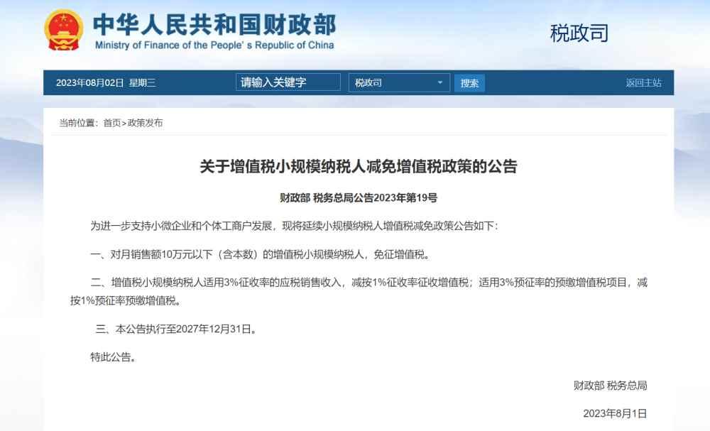 為進一步支持小微企業和個體工商戶發展,現將延續小規模納稅人增值稅減免政策公告如下: 一、對月銷售額10萬元以下(含本數)的增值稅小規模納稅人,免征增值稅。 二、增值稅小規模納稅人適用3%征收率的應稅銷售收入,減按1%征收率征收增值稅;適用3%預征率的預繳增值稅項目,減按1%預征率預繳增值稅。 三、本公告執行至2027年12月31日。 特此公告。 財政部 稅務總局 2023年8月1日 【編輯:丘志彬】