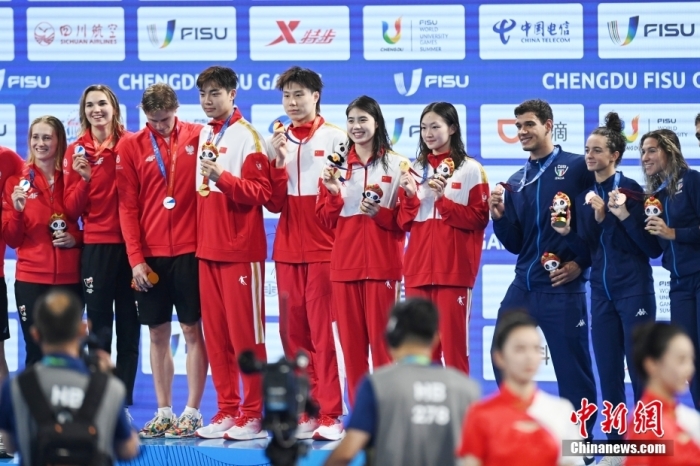 中國隊運動員在冠軍領獎台上。中新社記者 張浪 攝 8月3日,成都大運會共產生32枚金牌,中國代表團在遊泳、田徑、跳水、體操、乒乓球、跆拳道等項目上捷報頻傳。 遊泳賽場,張雨霏贏得她在本屆大運會上的第四金。這位“蝶後”在其非主項的女子100米自由泳決賽中,以53秒34的成績再次奪冠,並打破賽會紀錄。 這也是中國遊泳隊在本屆大運會上的第六枚金牌。遊泳賽程尚未過半,中國遊泳隊已追平2011年在深圳創造的6枚金牌的大運會最佳戰績。 田徑賽場掀起奪金高潮,10枚金牌名花有主,中國隊獲得1金1銀1銅。在男子三級跳遠決賽中,粟文以17.01米的成績奪冠,黃華鋒獲得銅牌。蘇玲丹以57.87米獲得女子標槍銀牌,土耳其選手獲得該項目金牌。