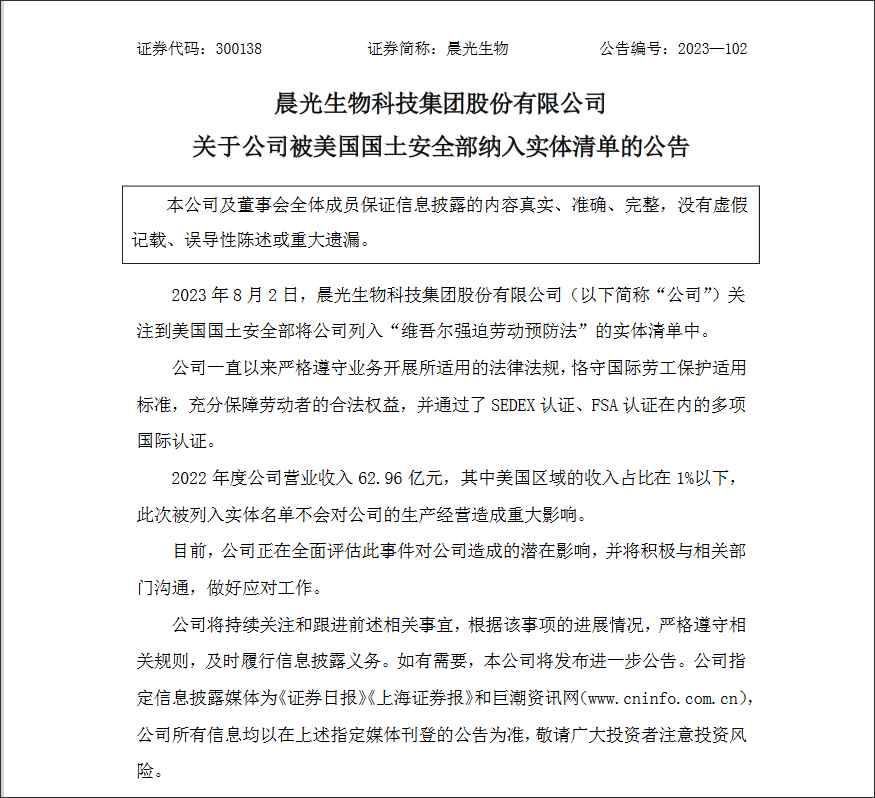香港新聞網8月4日電 晨光生物8月4日在互動平台上稱,公司關注到美國國土安全部將公司列入“維吾爾強迫勞動預防法”的實體清單中。公司不存在所謂“強迫勞動”的情形,一直以來嚴格遵守業務開展所適用的法律法規,恪守國際勞工保護適用標準,充分保障勞動者的合法權益,並通過了Sedex、FSA在內的多項國際認證。作為農業產業化的植物提取行業龍頭企業,自2006年成立第一家新疆子公司起,公司長期深耕新疆,助力新疆群眾種植辣椒、萬壽菊超80萬畝,帶動30萬農民脫貧,為新疆地區農業結構調整、解決就業、脫貧致富做出了突出貢獻。 公司2022年度對美國區域出口收入占營業收入比重小於1%,預計此次被列入實體名單不會對公司的生產經營造成重大影響。公司正在全面評估此事件對公司造成的潛在影響,做好應對工作。 美國國土安全部將公司及公司子公司列入“維吾爾強迫勞動預防法”的實體清單,沒有任何事實依據,我們對此深感震驚和困惑。 公司呼籲美國國土安全部本著公平、公正、無歧視的原則,重新進行審視,將公司及公司子公司移出實體清單,必要時公司將采取所有合理、恰當的措施,以維護公司和合作夥伴的權益。 8月3日晚,晨光生物發表“關於公司被美國國土安全部納入實體清單的公告”,針對美國國土安全部將公司納入“維吾爾族強迫勞動預防法”實體清單中一事作出回應,稱其生產經營不會受到重大影響並將積極與有關部門溝通,做好相應工作。