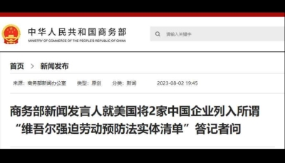 據商務部網站8月3日消息,商務部新聞發言人表示,近期美方宣佈將2家中國企業及其部分下屬公司列入所謂“維吾爾強迫勞動預防法實體清單”,美方此舉缺乏事實依據,毫無透明度,是典型的經濟脅迫行為。中方對此強烈譴責,堅決反對。 【編輯:丘志彬】