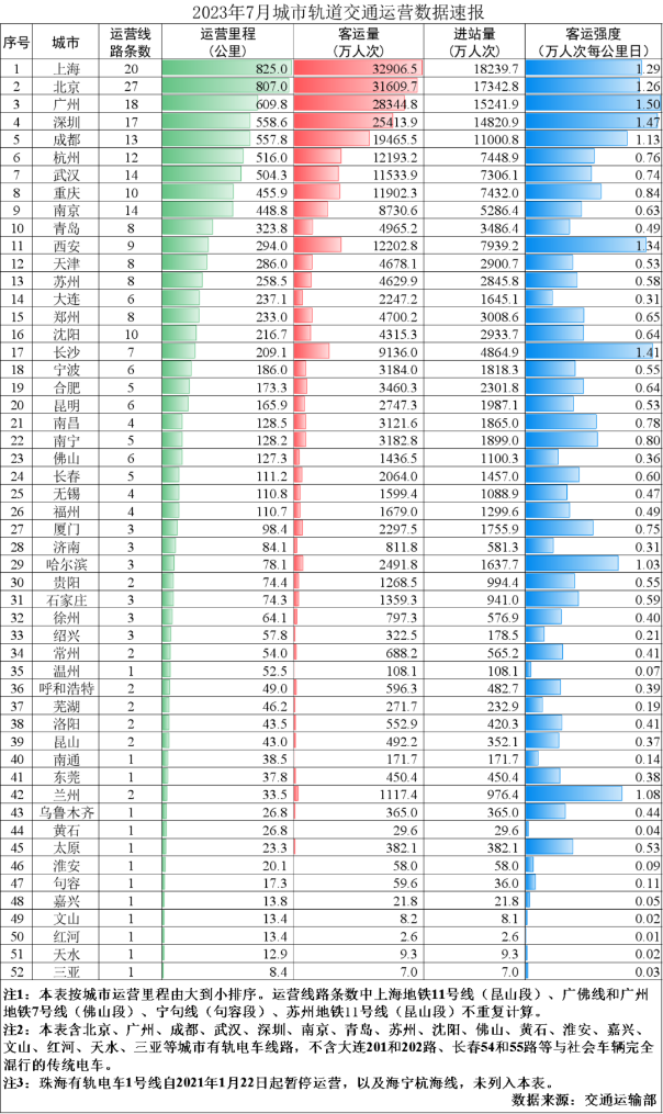 香港新聞網8月4日電 據中國交通運輸部消息,7月份中國31個省(自治區、直轄市)和新疆生產建設兵團共有54個城市開通運營城市軌道交通線路296條,完成客運量26.6億人次,進站量16億人次。