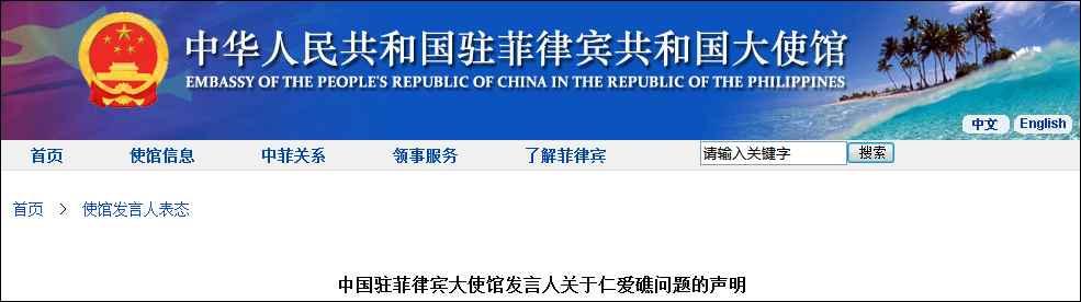 香港新聞網8月9日電 中國駐菲律賓大使館網站8月8日發佈中國駐菲律賓大使館發言人關於仁愛礁問題的聲明。