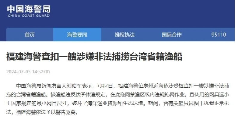 據央視新聞客戶端報道,日前,中國海警局直屬第二局台州艦、中國海警局直屬第三局萬山艦在中國東海海域執行巡航任務時,發現一艘正在違規拖網作業的漁船。由於正處海洋伏季休漁期,中國海警局直屬第二局執法員立即喊話示警,要求其停船接受檢查。 中國海警局直屬第二局執法員:閩惠漁01881,請你們立刻停船接受檢查。