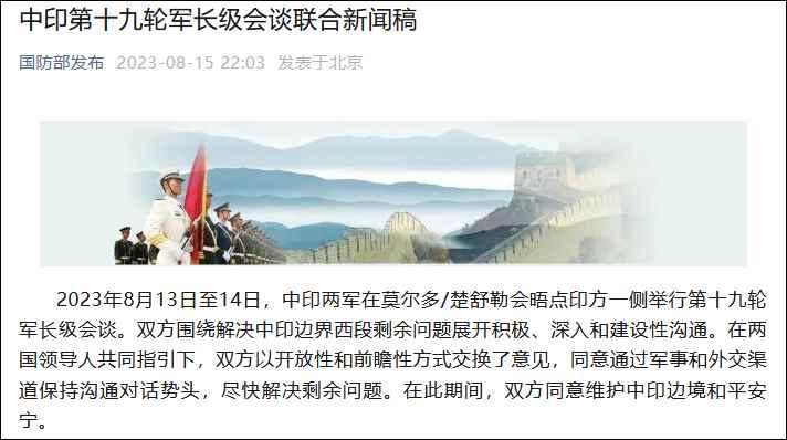香港新聞網8月16日電 據微信公眾號“國防部發佈”8月15日消息,8月13日至14日,中印兩軍在莫爾多/楚舒勒會晤點印方一側舉行第十九輪軍長級會談。雙方圍繞解決中印邊界西段剩餘問題展開積極、深入和建設性溝通。在兩國領導人共同指引下,雙方以開放性和前瞻性方式交換了意見,同意通過軍事和外交渠道保持溝通對話勢頭,盡快解決剩餘問題。在此期間,雙方同意維護中印邊境和平安寧。