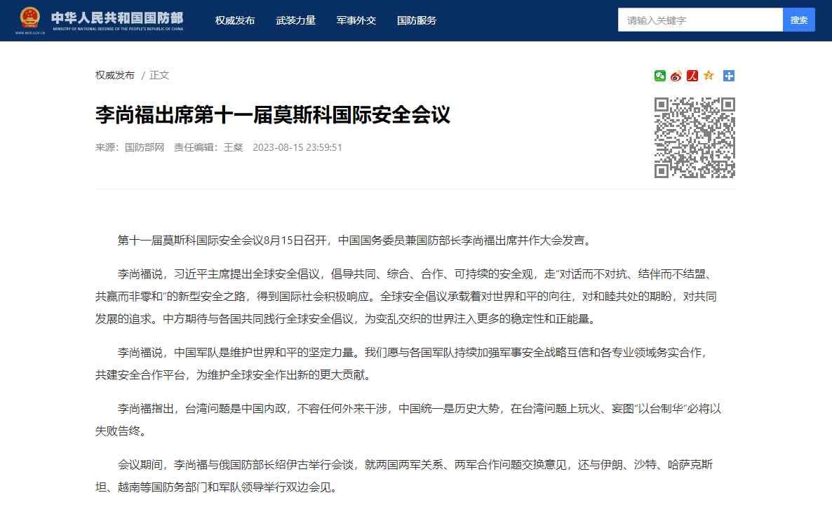 香港新聞網8月16日電 據國防部網站消息,第十一屆莫斯科國際安全會議8月15日召開,中國國務委員兼國防部長李尚福出席並作大會發言。