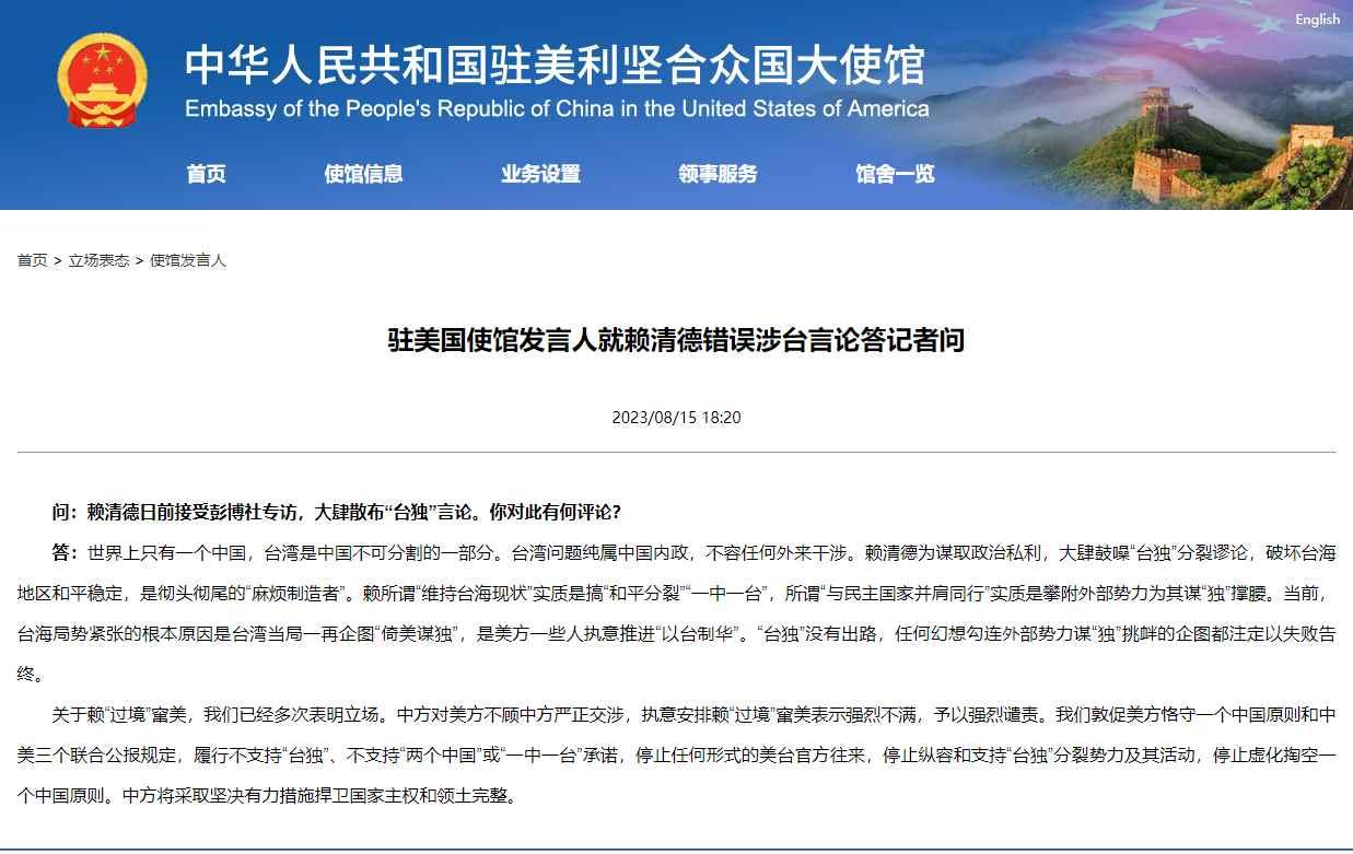 香港新聞網8月16日電 據中國駐美國大使館網站8月15日消息,駐美國使館發言人就賴清德錯誤涉台言論答記者問。