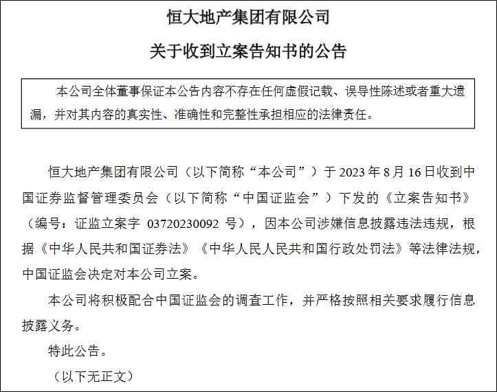 公告稱,恒大地產集團有限公司於2023年8月16日收到中國證券監督管理委員會下發的《立案告知書》(編號:證監立案字03720230092號),因恒大地產集團涉嫌信息披露違法違規,根據《中華人民共和國證券法》《中華人民人民共和國行政處罰法》等法律法規,中國證監會決定對該公司立案。