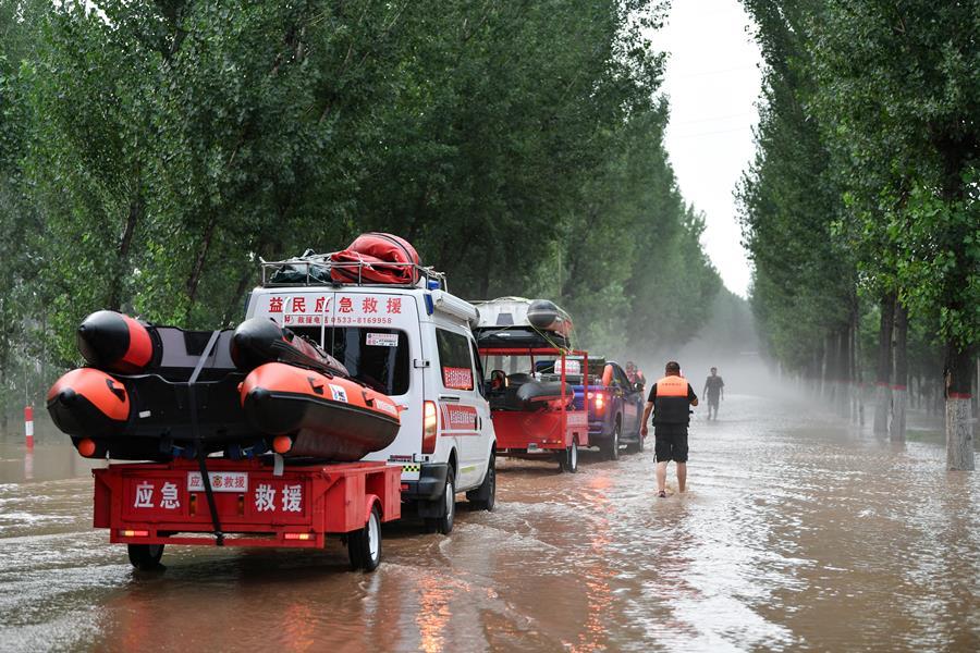 圖為8月1日,河北省涿州市刁窩鎮塔照村附近被洪水淹沒,救援人員準備涉水進入被困村莊。 香港中通社圖片 【編輯:丘志彬】