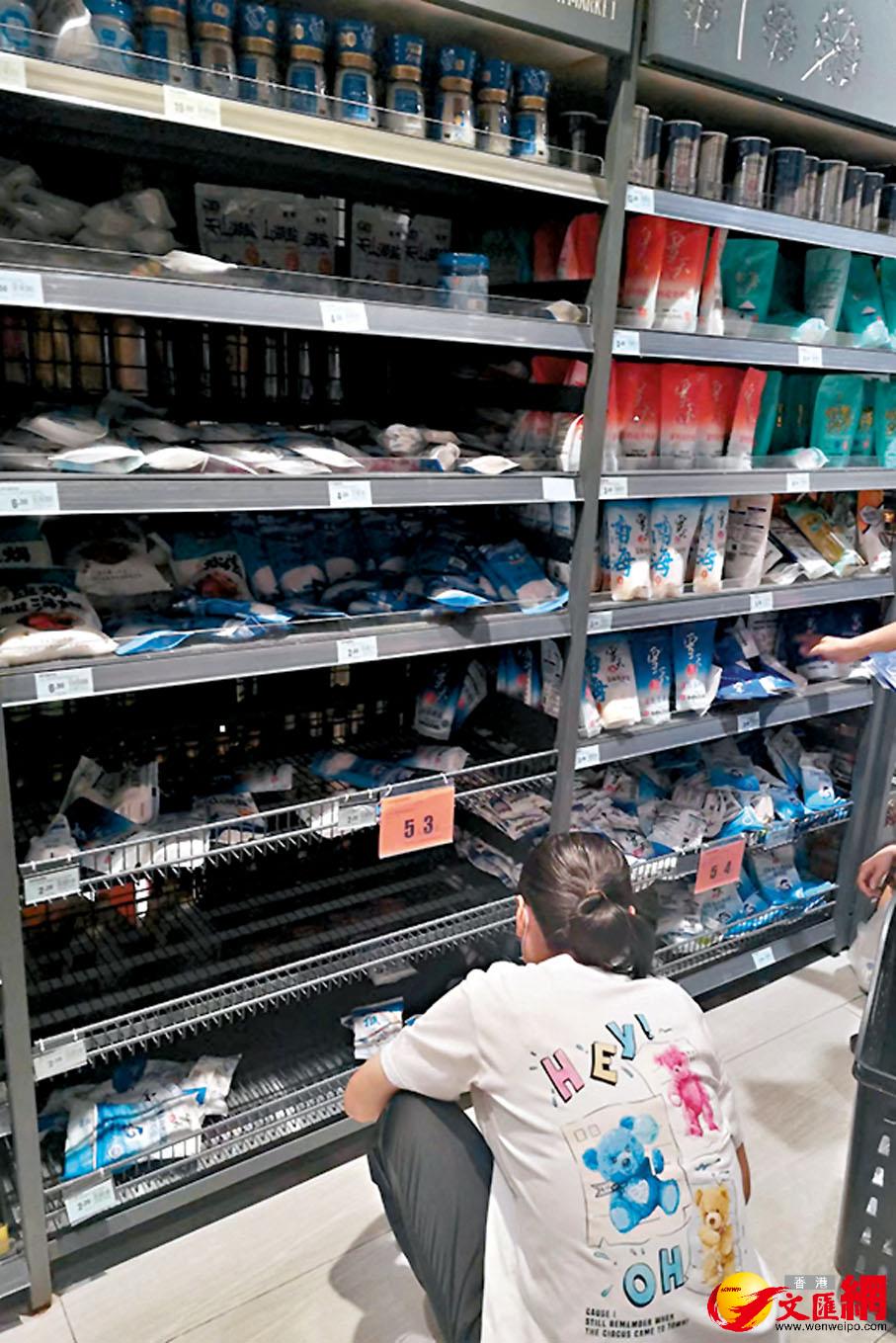 在福州,永輝超市部分門店出現食鹽搶購情況,外賣平台樸樸、永輝生活食鹽賣斷貨。在上海,記者查詢商超App,海鹽類產品也顯示售罄。24日下午接近5點時,記者在廣州盒馬鮮生某門店看到,調味料貨架的兩層食鹽區裏只剩下三袋加碘鹽。隨即,一位奶奶將三包全部買走,食鹽賣空。在另一家生活超市裏,擺放食鹽的兩個大貨架前站滿了顧客,其中一邊貨架多層見空。一名工作人員說:“今天來買鹽的人特別多。” 廣東:供應安全充足 將嚴密監控 根據廣東媒體的報道,海鹽在廣東食鹽市場中佔據超三分之一。廣東鹽業集團負責人在當天對媒體表示,目前,廣東省、市兩級食鹽政府儲備量和企業社會責任儲備共10.8萬噸,可以百分百覆蓋全省各地,能夠保障省內食鹽充足供應,並呼籲市民不必恐慌“囤鹽”。“自日本宣布試運行排放核污水後,我們已對廣東省主要海鹽生產工區的海域海水及生態海鹽進行了α、β放射性項目的第三方送樣檢測,結果顯示目前的廣東海鹽是安全的。”廣東鹽業集團負責人表示,將對廣東海水定期進行放射性元素送檢,並嚴密監控鹽產品是否受污染的情況。 中鹽集團:勿盲目搶購 盼理性消費 當晚,中鹽集團的公告也讓內地民眾感到安心。中鹽集團在公告中表示,中鹽集團是世界最大的食鹽生產企業,食鹽產能超過1,000萬噸/年,其中井礦鹽佔比95%、湖鹽佔比4%、海鹽佔比1%。中鹽集團在全國有完善的產銷企業布局,食鹽儲備供應充足:“近期,部分區域市場發生食鹽搶購,電商及部分商超渠道有短時缺貨現象,我們正在加班加點生產、配送,全力以赴保障市場供應。請社會各界理性消費,不要盲目搶購。”