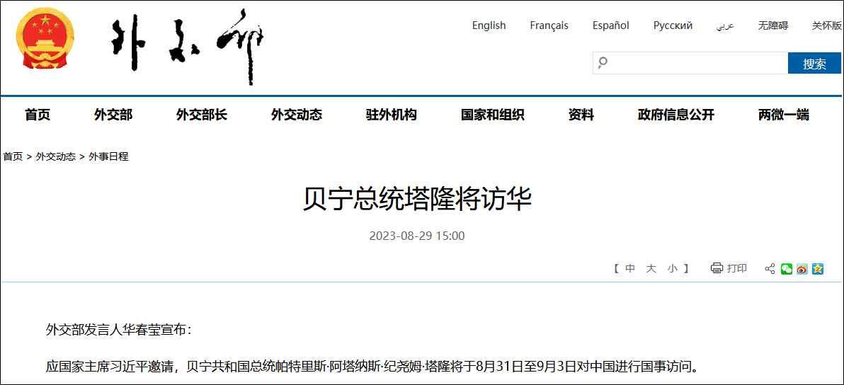 香港新聞網8月29日電 據中國外交部網站8月29日消息,外交部發言人華春瑩宣佈:應國家主席習近平邀請,貝寧共和國總統帕特里斯·阿塔納斯·紀堯姆·塔隆將於8月31日至9月3日對中國進行國事訪問。