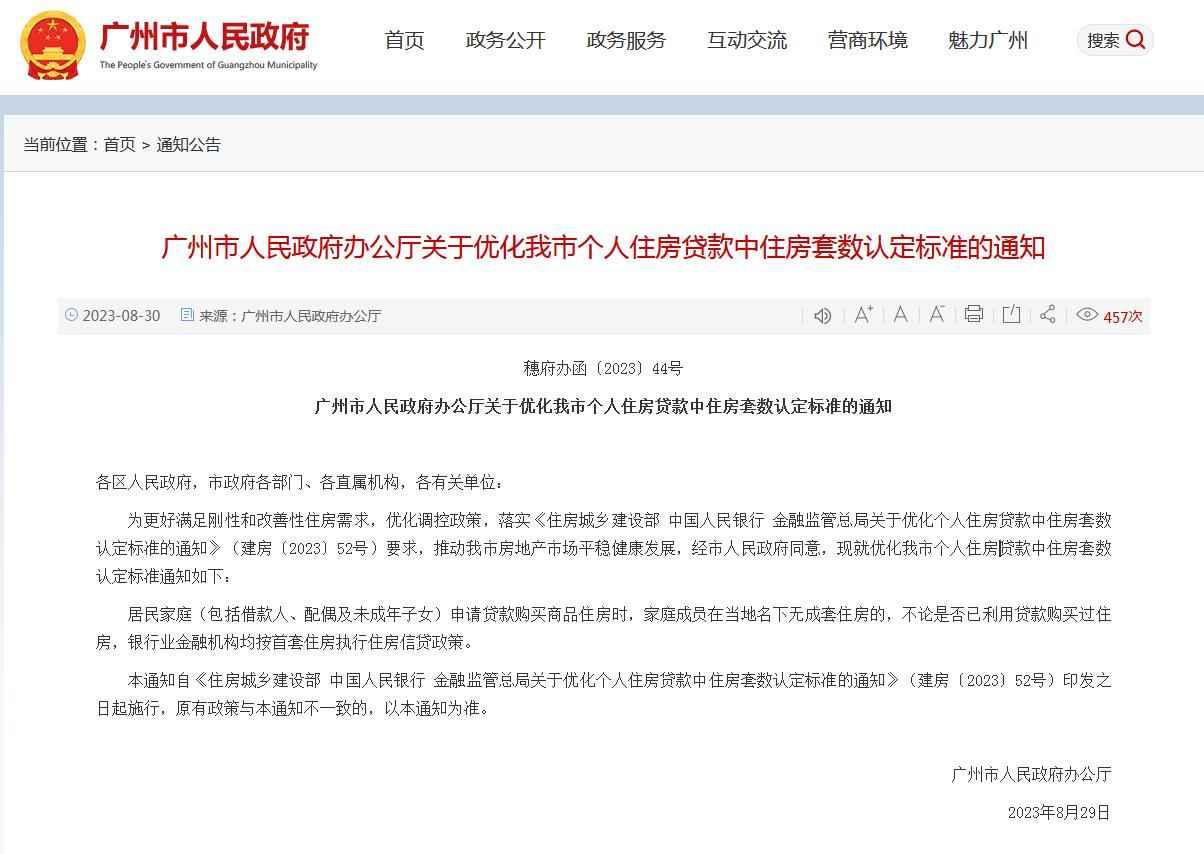 香港新聞網8月30日電 廣州市人民政府辦公廳今日(30日)發布關於優化廣州市個人住房貸款中住房套數認定標準的通知,全文如下: 各區人民政府,市政府各部門、各直屬機構,各有關單位: 為更好滿足剛性和改善性住房需求,優化調控政策,落實《住房城鄉建設部 中國人民銀行 金融監管總局關於優化個人住房貸款中住房套數認定標準的通知》(建房〔2023〕52號)要求,推動廣州市房地產市場平穩健康發展,經市人民政府同意,現就優化廣州市個人住房貸款中住房套數認定標準通知如下: 居民家庭(包括借款人、配偶及未成年子女)申請貸款購買商品住房時,家庭成員在當地名下無成套住房的,不論是否已利用貸款購買過住房,銀行業金融機構均按首套住房執行住房信貸政策。 本通知自《住房城鄉建設部 中國人民銀行 金融監管總局關於優化個人住房貸款中住房套數認定標準的通知》(建房〔2023〕52號)印發之日起施行,原有政策與本通知不一致的,以本通知為準。