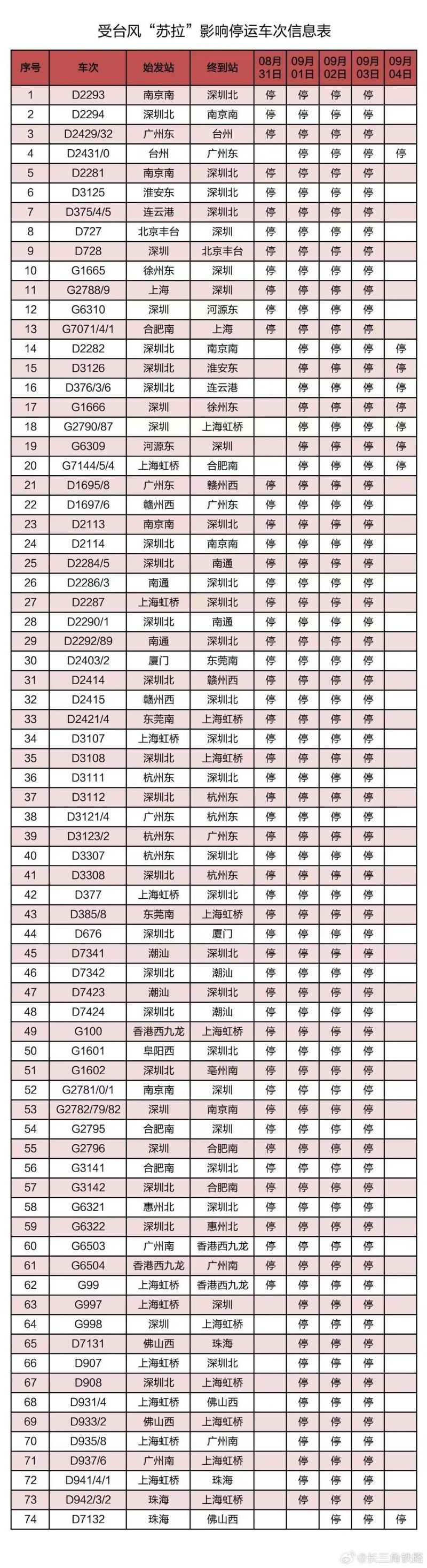 部分列車停運 據中國鐵路上海局集團公司消息,受第9號颱風“蘇拉”影響,為確保列車運行安全,鐵路部門計劃對杭深線、京港高鐵、廣深城際、廣深港高鐵、穗深城際、京九線等線路運行的部分列車采取停運措施。截至30日17時30分,計劃停運8月31日至9月6日間共121趟旅客列車:其中停運動車組列車74趟,停運普速列車47趟。