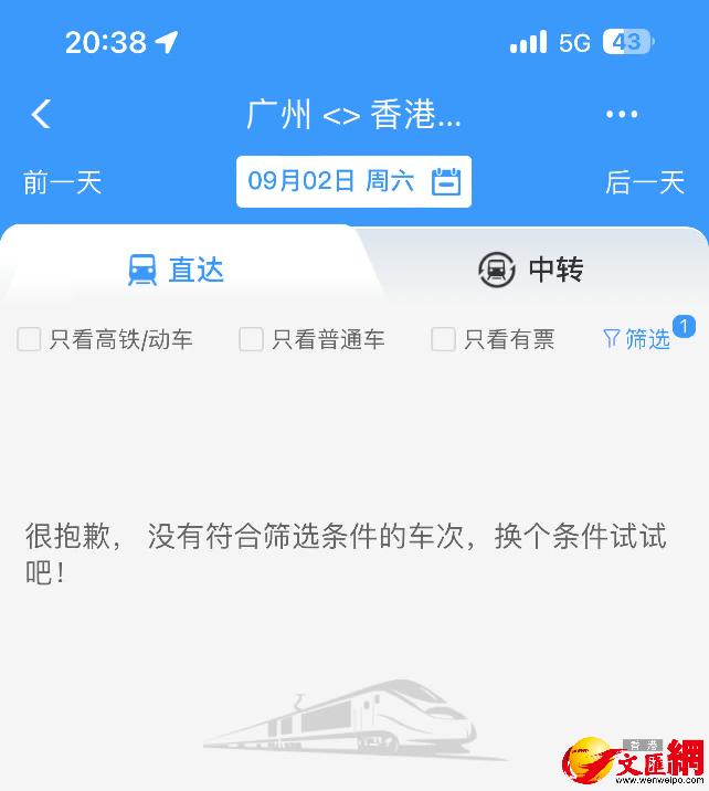 12306官網顯示,9月2日,廣州發往香港高鐵停運。香港文匯網記者 敖敏輝攝 8月31日下午,珠三角和粵東地區城市紛紛發布“五停”、“六停”通告,當日傍晚,更迎來一波“通告潮”,至截稿時止,廣東共有13個城市宣布了“五停”通告。部分城市不斷升級防禦措施,其中,深圳機場的停運通告,廣受關注。深圳機場通告指出,根據颱風“蘇拉”影響評估,為確保旅客朋友的出行安全,深圳機場將於9月1日12時起暫停所有進出港航班運行,恢復運行時間將根據颱風動態和影響情況而定。也就是說,1日中午後,深圳機場將暫時沒有航班起飛或抵達。 超強颱風來襲,除了機場,鐵路運輸特別是高鐵列車同樣影響大。記者通過12306官網查詢得知,9月1日,廣州東站已經全部停運赴香港的高鐵,全市僅有廣州南站3趟始發列車前往香港,且全部集中在上午。同一天,深圳發往香港的高鐵列車亦只有20躺,同樣集中在上午12時之前。2日全天,廣州、深圳發往香港的高鐵列車全部停運,而廣深之間亦僅有少量高鐵車次往返。 據廣鐵集團31日發布消息,8月31日至9月3日之間,廣鐵將停運3975列列車,其中動車組3540列,佔比接近90%。值得一提的是,9月1日是中小學、高校集中返校的時間,停課、停運對師生出行造成較大困擾。廣東高校數量、在校大學生數量位居全國前列,特別是已預定前往高校報到的大學新生,南下廣東將受阻。 【編輯:丘志彬】