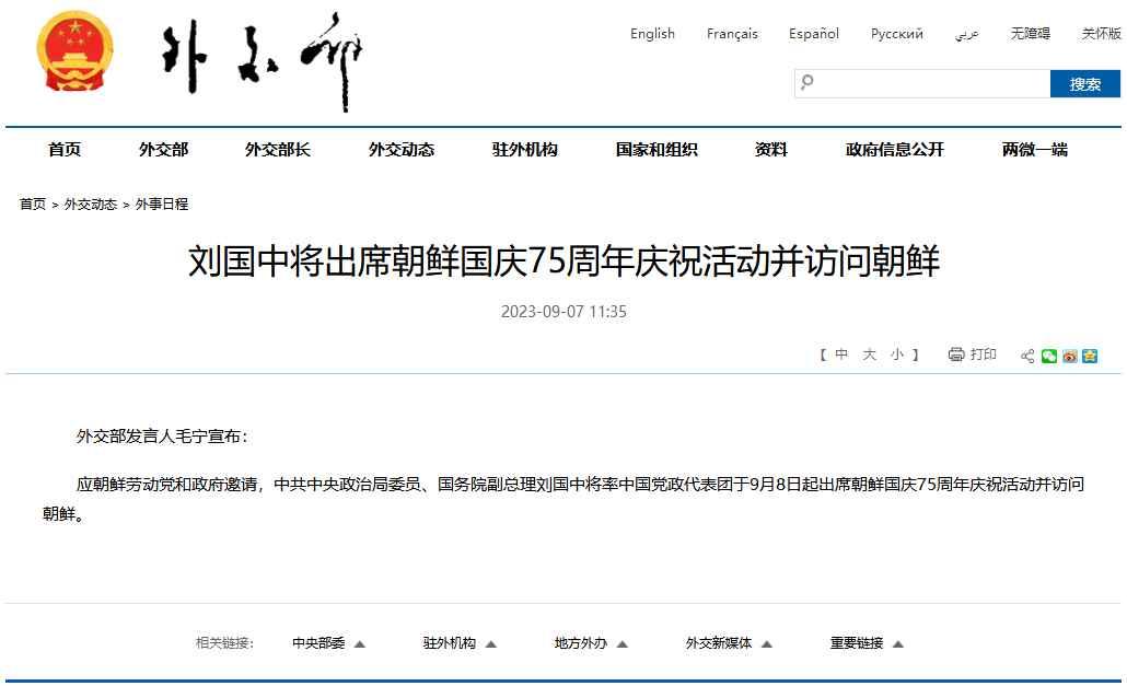 香港新聞網9月7日電 據中國外交部網站9月7日消息,外交部發言人毛寧宣佈:應朝鮮勞動黨和政府邀請,中共中央政治局委員、國務院副總理劉國中將率中國黨政代表團於9月8日起出席朝鮮國慶75周年慶祝活動並訪問朝鮮。