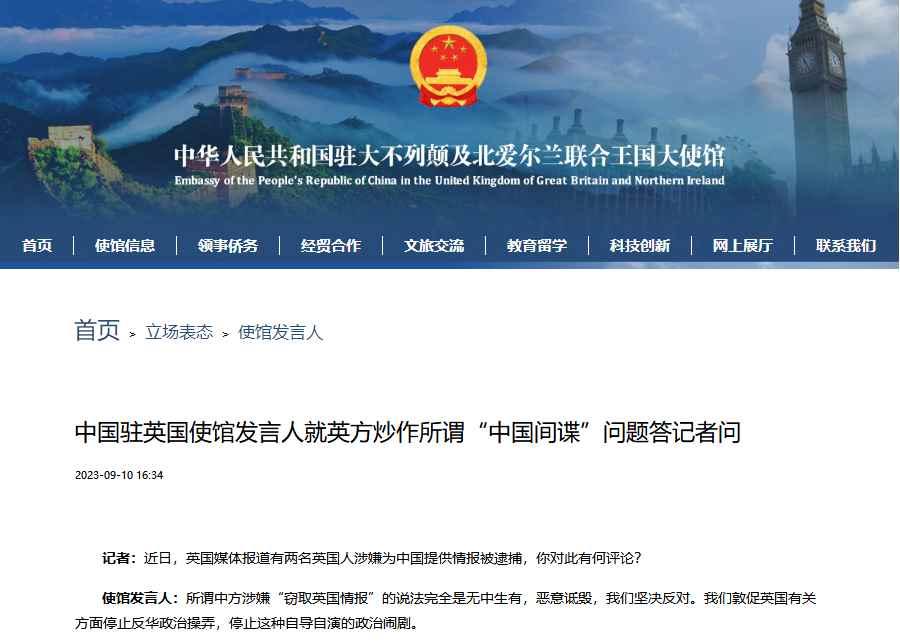香港新聞網9月11日電 據中國駐英國使館網站消息,9月10日,中國駐英國使館發言人就英方炒作所謂“中國間諜”問題答記者問。