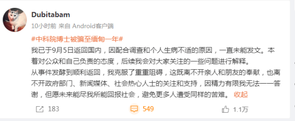 微博截圖 綜合報道,11日晚11時,一個名為“Dubitabam”的微博帳號發帖,稱自己是“被騙至緬甸的中科院博士”。該帳號稱:“從事件發酵到順利返回,我克服了重重阻礙,這既離不開親人和朋友的奉獻,也離不開政府部門、新聞媒體、社會熱心人士的關注和支持,因精力有限我無法一一答謝,但願未來能盡我所能回報社會,避免更多人遭受同樣的苦難。” 該帳號註册於9月4日,在個人簡介中填寫為“博士被騙緬甸事件當事人”。12日早上7時許,該帳號再次發帖,談及被詐騙的經歷。 帖文內容稱:“事發地妙瓦底位於緬甸的東南地區,與泰國僅隔一條小河,與網傳的緬北相隔甚遠。因為不與中國接壤,中國方面要進入該地極其困難,這裡的詐騙模式、詐騙對像也和緬北差別巨大。由於緬甸的詐騙過於有名,園區招聘時,通常也以泰國的工作為誘餌,而避免談及緬甸。” 在這兩條帖文下,不少網民留言詢問是否為張繼效本人,關心其身體是否安康,稱“回來就好,好好工作,好好生活”,也有網民表示“把你的遭遇講出來,即使能避免一個人被騙,也是值得的”。 對於發文者是否為張繼效本人,有媒體向張繼效的家人、女友核實了解情況,均未獲得回應。 張繼效畢業於中國科學院地球環境研究所,並一直從事研究工作。他在去年8月因投資虛擬貨幣失利,造成數萬元人民幣的債務問題,經人介紹被誤導認為可以去新加坡從事翻譯工作。然而,他卻被騙到了緬甸的詐騙園區,每天被迫工作長達18小時,有時甚至受到毆打和監禁。事件引發廣泛關注。8月24日,張繼效的哥哥稱,弟弟已被解救。(完) 【編輯:丘志彬】