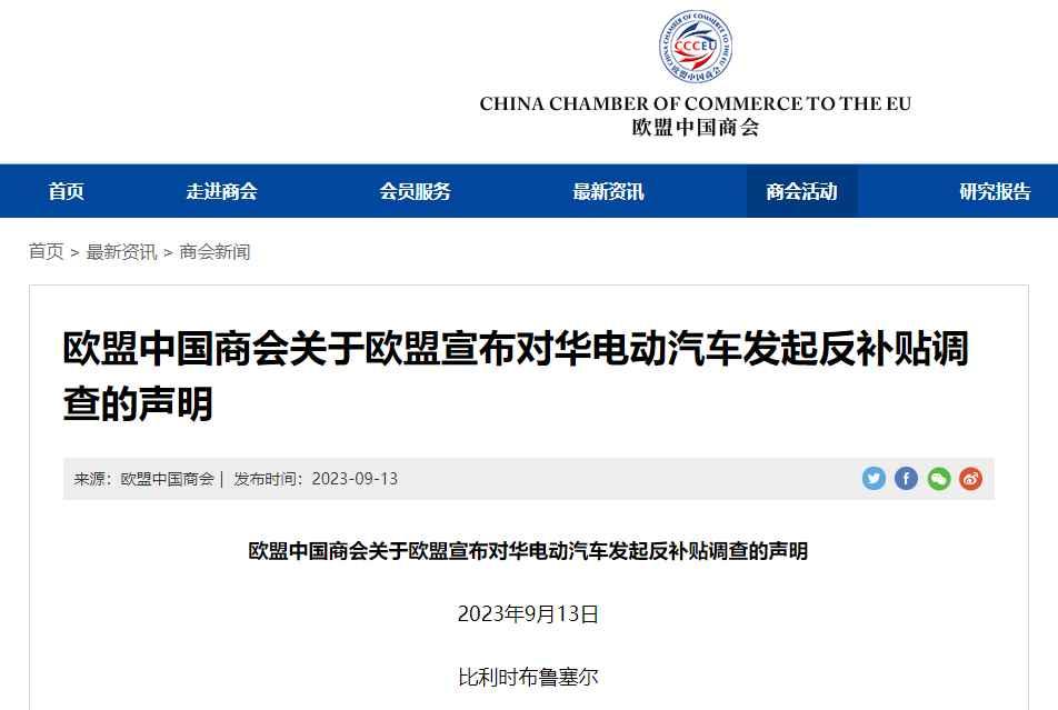 歐盟對中國電動汽車發起反補貼調查,歐盟中國商會回應分享到: