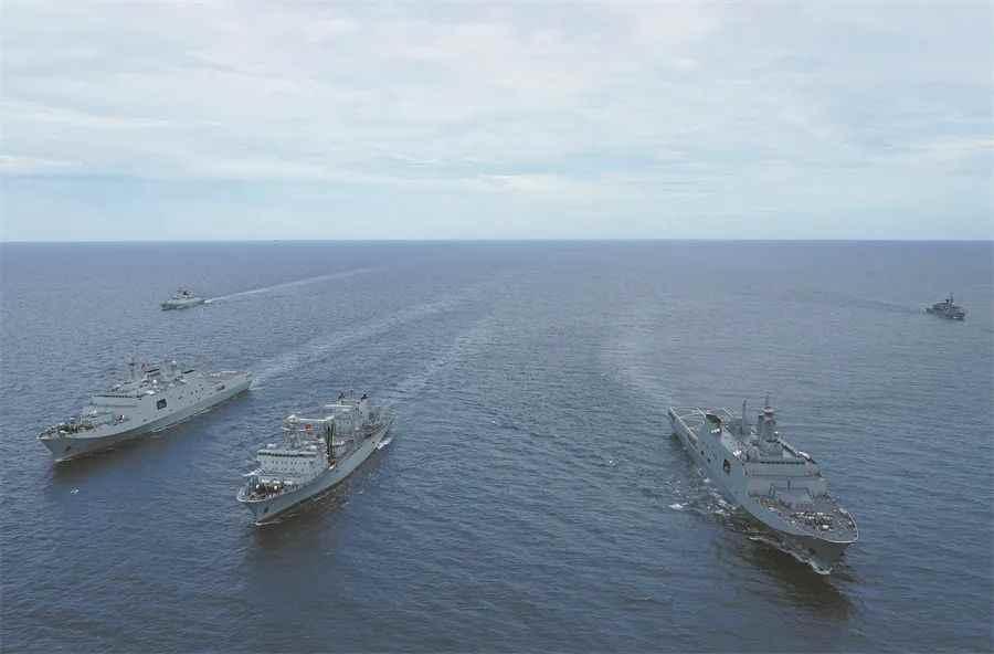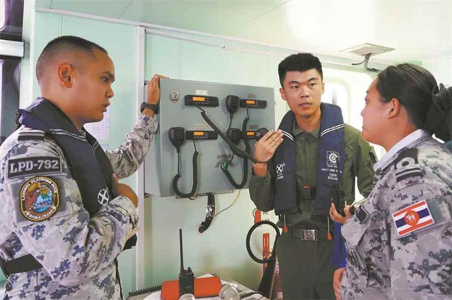 雙方艦艇進行聯訓。李昊攝 聯訓期間,雙方陸戰分隊共同進行了城市戰、小型策略執行交流、輕武器射擊、狙擊戰術、機滑降、戰場急救、野外生存、人道主義援助和救災等課目訓練,艦艇部隊共同參加了海上補給、機動演練、人道主義援助和救災、聯合反潛等課目訓練。