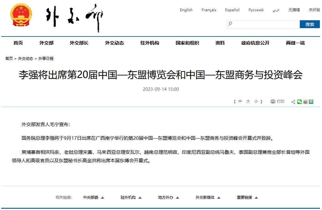國務院總理李強將於9月17日出席在廣西南寧舉行的第20屆中國—東盟博覽會和中國—東盟商務與投資峰會開幕式並致辭。
