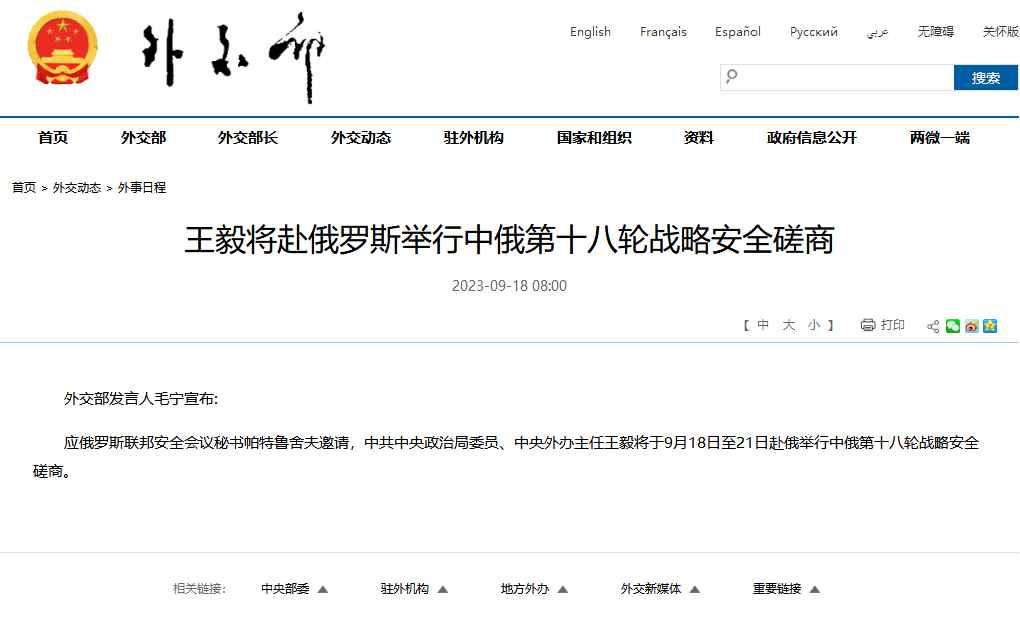 應俄羅斯聯邦安全會議秘書帕特魯舍夫邀請,中共中央政治局委員、中央外辦主任王毅將於9月18日至21日赴俄舉行中俄第十八輪戰略安全磋商。