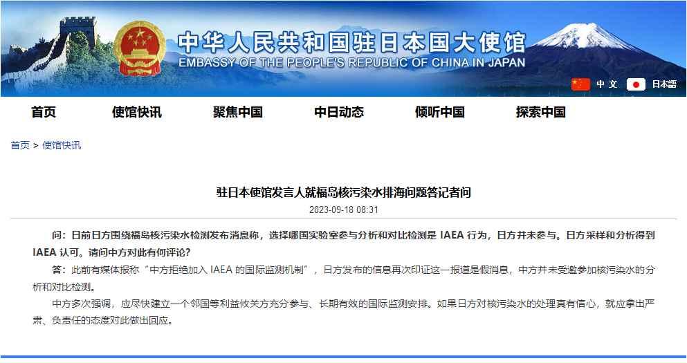 香港新聞網9月18日電 據中國駐日本使館網站18日消息,駐日本使館發言人就福島核污染水排海問題答記者問。