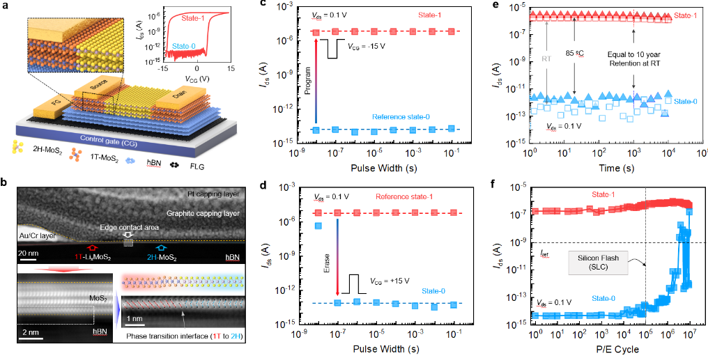 圖為邊緣接觸式二維浮柵存儲器的表征及其操作性能。(受訪單位供圖) 浮柵晶體管作為一種電荷存儲器,是構成當前大容量固態存儲器發展的核心元器件。然而,當前商業閃存內矽基浮柵存儲器件所需的擦寫時間約在10微秒至1毫秒範圍內,遠低於計算單元CPU納秒級的數據處理速度,且其循環耐久性約為10萬次,也難以滿足頻繁的數據交互。隨著計算機數據吞吐量的爆發式增長,發展一種可兼顧高速、高循環耐久性的存儲技術勢在必行。 二維材料具有原子級厚度和無懸掛鍵表面,在器件集成時可有效避免窄溝道效應和界面態釘紮等問題,是實現高密度集成、高性能閃存器件的理想材料。然而,在此前的研究中,其數據擦寫速度多異常緩慢,鮮有器件可同時實現高速和高循環耐久性。面對這一挑戰,翟天佑團隊研制了一種具有邊緣接觸特征的新型二維浮柵晶體管器件,通過對傳統金屬-半導體接觸區域內二硫化鉬進行相轉變,使其由半導體相(2H)向金屬相(1T)轉變,使器件內金屬-半導體接觸類型由傳統的3D/2D面接觸過渡為具有原子級銳利界面的2D/2D型邊緣接觸,實現了擦寫速度在10納秒至100納秒、循環耐久性超過300萬次的高性能存儲器件。 “通過對比傳統面接觸電極與新型邊緣接觸,該研究說明了優化制備二維浮柵存儲器件內金屬-半導體接觸界面對改善其擦寫速度、循環壽命等關鍵性能有重要作用。”翟天佑說。 這一成果以《基於相變邊緣接觸的高速、耐久二維浮柵存儲器》為題,於近日在線發表在國際學術期刊《自然·通訊》上。 【編輯:馬華】