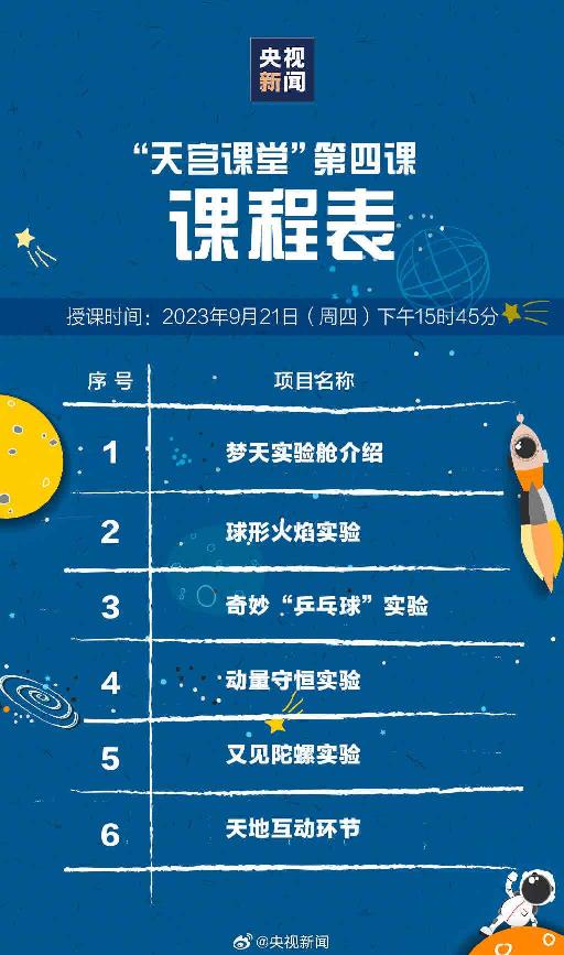 本次太空授課活動繼續採取天地互動方式進行。圖為課程表。(央視新聞微博圖片) 本次太空授課活動繼續採取天地互動方式進行。3名航天員將在軌展示介紹中國空間站夢天實驗艙工作生活場景,演示球形火焰實驗、奇妙“乒乓球”實驗、動量守恒實驗以及又見陀螺實驗,並與地面課堂進行互動交流。 空間站作為國家太空實驗室,承載着重要的科普教育職能。空間站任務以來,神舟十三號、神舟十四號乘組先後3次面向廣大青少年開展“天宮課堂”太空授課活動,社會反響熱烈,為中國科普教育工作作出重要貢獻。在前期開展的授課內容徵集活動中,社會各界特別是廣大青少年踴躍建言獻策,其中部分精彩創意設計將在此次授課及後續活動中陸續呈現。 神舟十六號航天員誠邀廣大青少年在地面同步嘗試開展相關實驗,從天地實驗差異中感知宇宙奧秘、體驗探索樂趣。 【編輯:丘志彬】