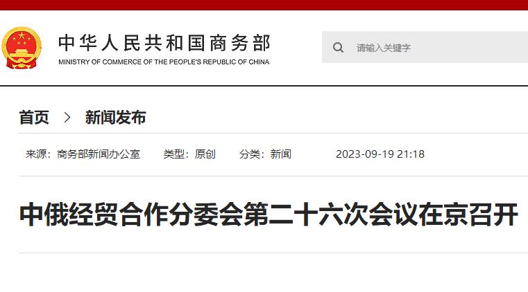 香港新聞網9月20日電 據中國商務部網站9月19日消息,19日,中國商務部部長王文濤與俄羅斯經濟發展部部長列舍特尼科夫在京共同主持召開中俄總理定期會晤委員會經貿合作分委會第二十六次會議,就雙邊經貿合作重點問題深入交換意見,為中俄總理定期會晤委員會第二十七次會議做相應準備。