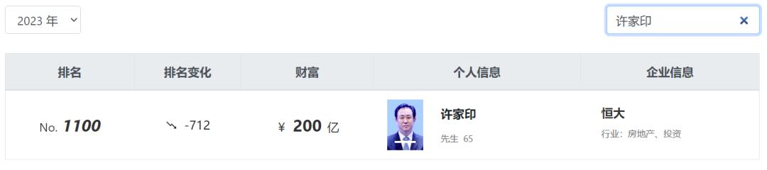 公開資料顯示,9月19日,恒大地產集團有限公司新增3條被執行人信息,執行標的合計9.8億余元,涉及票據追索權糾紛等,執行法院為哈爾濱市中級人民法院、唐山市路北區人民法院、宿遷市宿城區人民法院。 目前,恒大地產集團有限公司存在超590條被執行人信息,被執行總金額超560億元,此外還存在多條限制消費令、失信被執行人(老賴)和終本案件信息。 據《2023胡潤全球富豪榜》顯示,許家印如今身家僅剩200億,全球排行第1100名,較去年下降712名,比2年前縮水超過90%。就在2年前的2021年,許家印身家還高達2040億元,全球排行第50名。