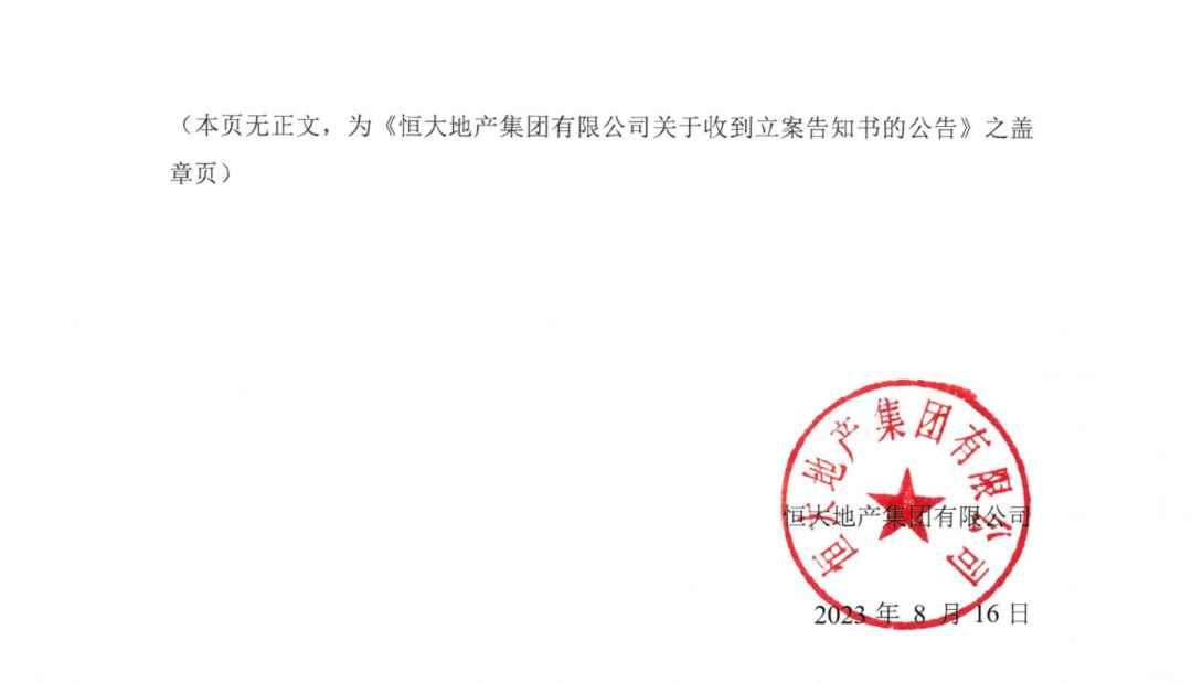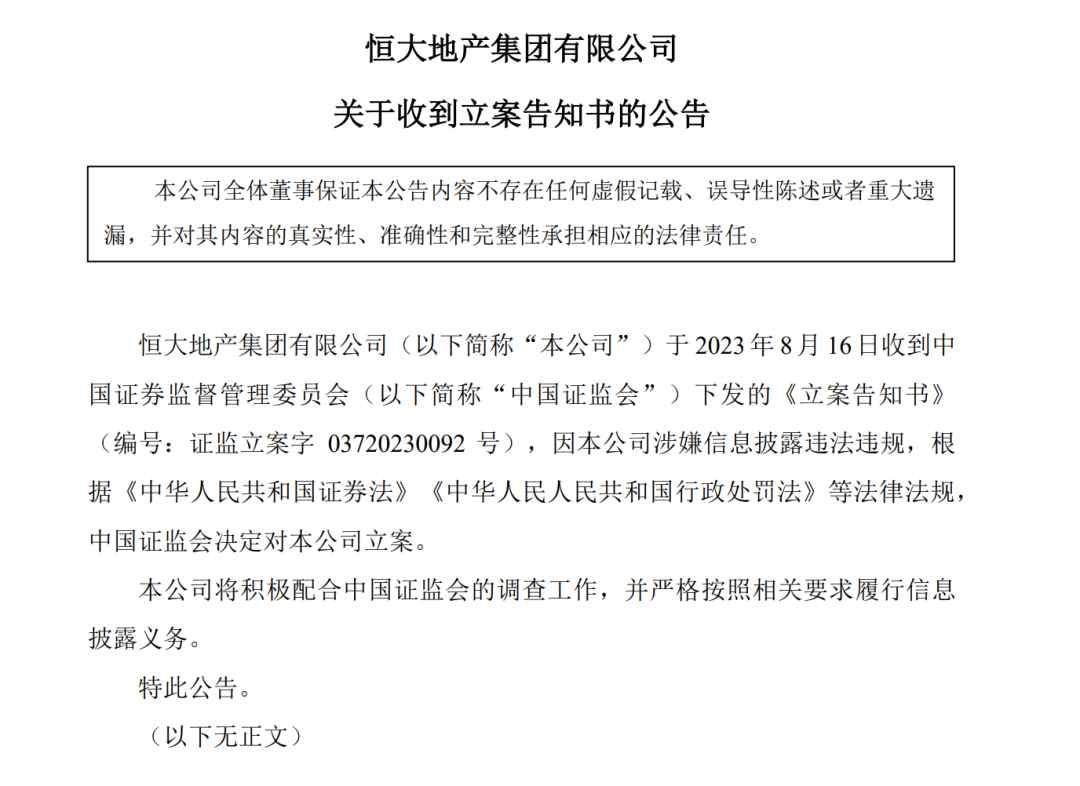 鑒於上述情況,原定於9月25日和9月26日有關建議重組的相關協議安排會議將不會舉行。若建議重組的條款有任何修改,公司將另行公告。 據悉,在此前3月份中國恒大發佈的債務重組方案中,擬議重組包括“恒大協議安排”“景程協議安排”和“天基協議安排”,其中“恒大協議安排”又包括A組和C組兩組債務。 9月8日晚,中國恒大發佈公告稱關於其景程協議安排、開曼群島恒大協議安排、香港恒大及天基協議安排的批準聆訊分別延後至北京時間10月3日晚10時、10月5日晚11時、10月16日及17日上午10時。 同時,恒大集團通過有關網站向債權人發佈聆訊延後通知稱,原定於9月20日在紐約南區破產法院召開的恒大集團境外債務重組認可聆訊,延期至美國東部時間10月25日上午11時。 恒大地產被立案 去年凈虧527億,已資不抵債 8月16日晚21時,恒大地產集團有限公司(以下簡稱恒大地產)在深交所發佈公告,稱收到中國證監會下發的《立案告知書》,因公司涉嫌信息披露違法違規,根據《中華人民共和國證券法》《中華人民共和國行政處罰法》等法律法規,中國證監會決定對恒大地產立案。 公司將積極配合中國證監會的調查工作,並嚴格按照相關要求履行信息披露義務。