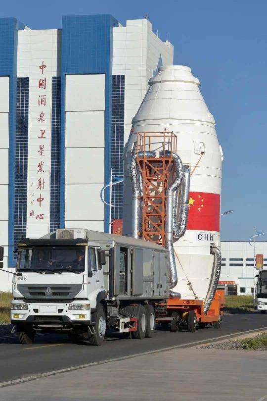 ▲ 星罩組合體轉運 執行本次發射任務的長征四號丙運載火箭為航天科技集團八院抓總研製的常溫液體三級運載火箭,具備發射多種類型、不同軌道要求衛星的能力,可實施一箭單星或多星發射,其太陽同步圓軌道運載能力可達3噸。