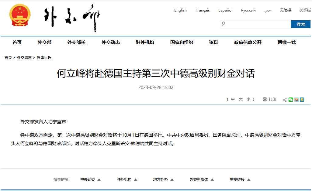 經中德雙方商定,第三次中德高級別財金對話將於10月1日在德國舉行。中共中央政治局委員、國務院副總理、中德高級別財金對話中方牽頭人何立峰將與德國財政部長、對話德方牽頭人克里斯蒂安·林德納共同主持對話。