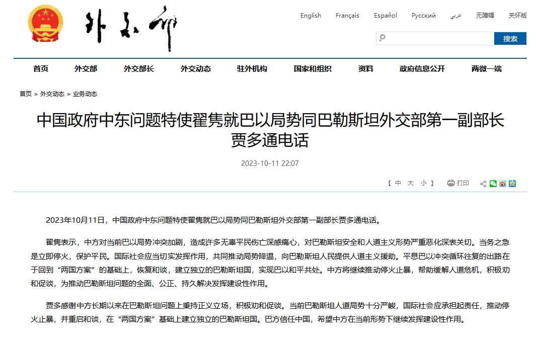 香港新聞網10月12日電 據中國外交部網站消息,10月11日,中國政府中東問題特使翟雋就巴以局勢同巴勒斯坦外交部第一副部長賈多通電話。
