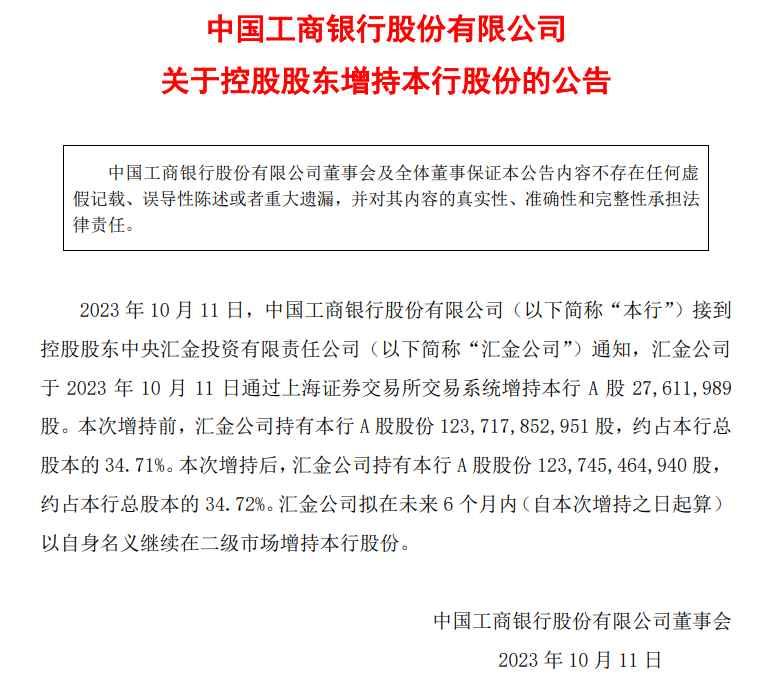 “國家隊”出手!匯金增持四大行股份,未來6個月內擬繼續增持香港新聞網10月12日電 10月11日晚間,四大行均發佈控股股東增持公告,獲中央匯金增持。 工商銀行公告,控股股東匯金公司10月11日增持本行2761萬股A股股份,擬在未來6個月內(自本次增持之日起算)以自身名義繼續在二級市場增持本行股份。