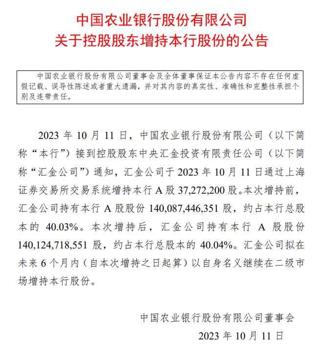 農業銀行發佈關於控股股東增持本行股份的公告稱,控股股東匯金公司於10月11日通過上海證券交易所交易系統增持本行A股3727.22萬股;匯金公司擬在未來6個月內(自本次增持之日起算)以自身名義繼續在二級市場增持本行股份。