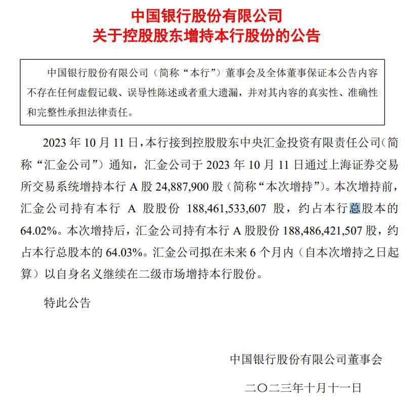 中國銀行也發佈關於控股股東增持本行股份的公告稱,控股股東匯金公司增持本行2488萬股A股股份。
