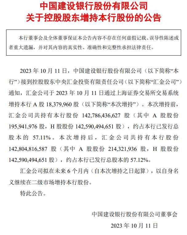 建設銀行公告,控股股東匯金公司10月11日增持本行1838萬股A股股份,擬在未來6個月內(自本次增持之日起算),以自身名義繼續在二級市場增持本行股份。