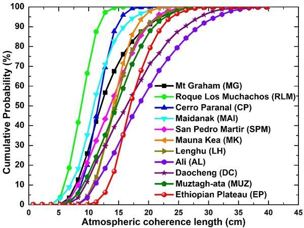 國際上著名天文台站大氣相幹長度累積分布預測結果。中國科學院合肥物質院 供圖 大氣湍流引起的大氣折射率隨機起伏會導致光在大氣中傳輸時產生光束漂移、閃爍和抖動等現象,嚴重限制了光電系統的性能,甚至決定了光電系統的技術可行性。大氣湍流在任何時間、任何地方幾乎始終存在,因此有效預測大氣光學湍流及其空間分布對優化光電系統的性能至關重要。 雖然有多種探測大氣光學湍流的技術和設備,但探測試驗成本高,已有觀測技術及設備易受到人力、物力、財力的局限,難以探測較大時空範圍大氣光學湍流參數。 圍繞未來光電系統的應用對廣域大氣光學湍流參數預測預報的需求,該研究團隊在國際上率先提出挖掘歷史探測數據集,融合大數據數理統計分析技術等,建立全球大氣光學湍流預測模型。該模型突破了探測廣域大氣光學湍流的局限,破解了預測及可視化表征廣域大氣光學湍流的關鍵科學與技術難題。 模型預測結果揭示了全球大氣光學湍流參數時空分布特征,指出除了在青藏高原、美洲西海岸、夏威夷群島等優秀天文台站具有較好大氣光學湍流條件之外,在西太平洋、非洲東北部等地區同樣具有較好的大氣光學湍流條件,並且在“非洲屋脊”埃塞俄比亞高原還存在一個大氣光學湍流條件較好的區域。 【編輯:丘志彬】