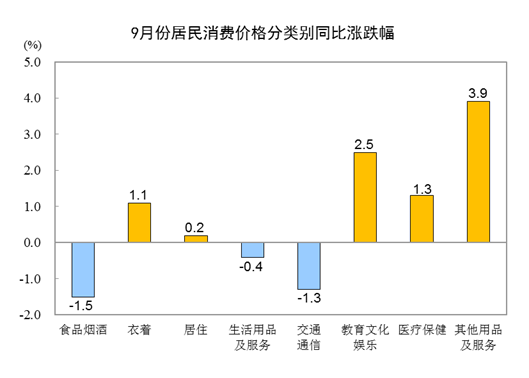 一、各類商品及服務價格同比變動情況 9月份,食品煙酒類價格同比下降1.5%,影響CPI(居民消費價格指數)下降約0.44個百分點。食品中,畜肉類價格下降12.8%,影響CPI下降約0.45個百分點,其中豬肉價格下降22.0%,影響CPI下降約0.37個百分點;鮮菜價格下降6.4%,影響CPI下降約0.14個百分點;水產品價格下降1.5%,影響CPI下降約0.03個百分點;鮮果價格下降0.3%,影響CPI下降約0.01個百分點;蛋類價格上漲0.7%,影響CPI上漲約0.01個百分點;糧食價格上漲0.7%,影響CPI上漲約0.01個百分點。 其他七大類價格同比五漲兩降。其中,其他用品及服務、教育文化娛樂、醫療保健價格分別上漲3.9%、2.5%和1.3%,衣著、居住價格分別上漲1.1%和0.2%;交通通信、生活用品及服務價格分別下降1.3%和0.4%。