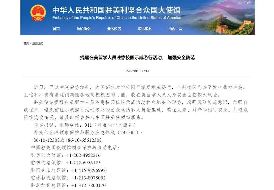 香港新聞網10月17日電 據中國駐美國大使館網站10月16日消息,近日,巴以衝突局勢加劇,美國部分大學校園裏爆發示威遊行,個別校園內甚至發生暴力衝突,且這種衝突有蔓延到美國各地高校校園的可能,中國在美留學人員人身安全面臨較大風險。
