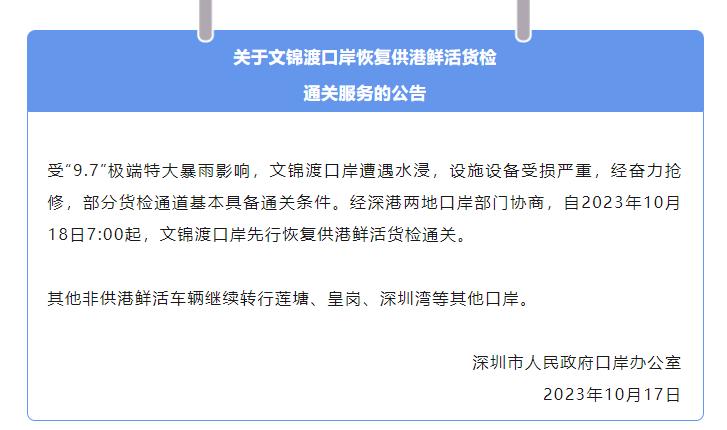 香港新聞網10月17日電 據微信公眾號“深圳口岸發佈”17日消息,自2023年10月18日7:00起,文錦渡口岸先行恢復供港鮮活貨檢通關。