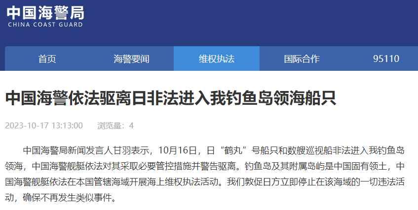 香港新聞網10月17日電 據中國海警局網站10月17日消息,中國海警局新聞發言人甘羽表示,10月16日,日“鶴丸”號船隻和數艘巡視船非法進入我釣魚島領海,中國海警艦艇依法對其採取必要管控措施並警告驅離。釣魚島及其附屬島嶼是中國固有領土,中國海警艦艇依法在本國管轄海域開展海上維權執法活動。我們敦促日方立即停止在該海域的一切違法活動,確保不再發生類似事件。