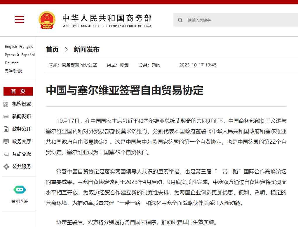 中國商務部網站截圖 簽署中塞自貿協定是落實兩國領導人共識的重要舉措,也是第三屆“一帶一路”國際合作高峰論壇的重要成果。中塞自貿協定談判於2023年4月啟動,9月底實質性完成。中塞雙方通過自貿協定將實現高水平相互開放,為雙邊經貿合作建立新的制度性安排,為兩國企業創造更加優惠、便利、透明、穩定的營商環境,為推動高質量共建“一帶一路”和深化中塞全面戰略夥伴關係注入新動能。 協定簽署後,雙方將分別履行各自國內程序,推動協定早日生效實施。 根據中國自由貿易區服務網,在此之前,中國已簽協議的自貿區包括: 中國-厄瓜多爾、中國-尼加拉瓜、《區域全面經濟夥伴關係協定》(RCEP)、中國-柬埔寨、中國-毛里求斯、中國-馬爾代夫、中國-格魯吉亞、中國-澳大利亞、中國-韓國、中國-瑞士、中國-冰島、中國-哥斯達黎加、中國-秘魯、中國-新西蘭(含升級)、中國-新加坡(含升級)、中國-智利(含升級)、中國-巴基斯坦(含第二階段)、中國-東盟(含“10+1”升級)、內地與港澳更緊密經貿關係安排。 商務部國際司負責人解讀中國—塞爾維亞自貿協定 10月17日,在中國國家主席習近平和塞爾維亞總統武契奇的共同見證下,中國商務部部長王文濤與塞爾維亞國內和對外貿易部部長莫米洛維奇,分別代表本國政府簽署《中華人民共和國政府和塞爾維亞共和國政府自由貿易協定》。商務部國際司負責人就中塞自貿協定的有關背景和內容進行了詳細介紹和解讀。 一、中塞自貿協定有何重要意義 中塞自貿協定是中國與中東歐國家簽署的第一個自貿協定,也是中國與相關國家和地區簽署的第22個自貿協定,塞爾維亞成為中國第29個自貿夥伴。中塞自貿協定的簽署是落實兩國領導人共識的重要舉措,是擴大面向全球的高標準自由貿易區網絡的又一重要實踐,也是第三屆“一帶一路”國際合作高峰論壇的重要成果。 塞爾維亞是我國共建“一帶一路”的重要合作夥伴。2022年,中塞雙邊貿易額35.6億美元,同比增長10.1%。中塞雙方通過自貿協定將實現高水平相互開放,為雙邊經貿合作建立新的制度性安排,為兩國企業創造更加優惠、便利、透明、穩定的營商環境,為推動高質量共建“一帶一路”和深化中塞全面戰略夥伴關係注入新動能。 二、中塞自貿協定談判經歷了怎樣的過程 商簽中塞自貿協定是兩國領導人達成的重要共識。談判從啟動到完成,總共只用了5個月時間,這得益於兩國領導人的戰略引領,充分體現了雙方高度的政治互信。 中塞自貿協定談判於2023年4月正式啟動,中方由商務部牽頭,塞方由國內和對外貿易部牽頭,各相關部門參加。雙方團隊密切溝通,在5個月時間內舉行了2輪正式談判和近30次工作組會議,於9月底實質性完成全部談判。10月17日,在習近平主席和武契奇總統的共同見證下,中塞自貿協定正式簽署。 三、中塞自貿協定主要包括哪些內容 中塞自貿協定包括序言和10個章節。在貨物相關章節方面,包括貨物貿易、原產地規則和實施程序、海關程序與貿易便利化3章。衛生與植物衛生措施、技術性貿易壁壘、貿易救濟等相關內容均納入貨物貿易章。 在其他規則領域方面,包括投資與服務、知識產權保護、競爭3章,以及一般條款、機制條款、爭端解決、最終條款等4個法律和機制章節。此外,協定還包括關稅承諾表、產品特定原產地規則、原產地證書、原產地聲明、仲裁庭程序規則、衛生合作與傳統中醫藥合作等6個附件。 塞爾維亞正在申請加入世貿組織,目前尚不是世貿組織成員,但雙方在自貿協定中承諾相關領域的權利義務和措施做法都應符合世貿組織規則要求。這充分體現了中塞雙方積極支持多邊貿易體制和經濟全球化的共同意願和堅定決心。 四、中塞自貿協定主要有哪些突出特點 中塞自貿協定重點就貨物貿易作出相關安排,主要有以下特點: 一是自由化水平高。中塞雙方將分別對90%的稅目相互取消關稅,其中,超過60%的稅目將在協定生效後立即取消關稅。雙方最終零關稅稅目的進口額比例都達到95%左右。 二是產品覆蓋面廣。塞方將中方重點關注的汽車、光伏組件、鋰電池、通訊設備、機械設備、耐火材料、部分農水產品等納入零關稅,有關產品關稅將從目前的5%-20%逐步降至零。中方將塞方重點關注的發電機、電動機、輪胎、牛肉、葡萄酒、堅果等納入零關稅,有關產品關稅也將從目前的5%-20%逐步降至零。 三是便利化措施實。雙方將深化海關合作,加強信息交流和溝通協調,並對簡化貿易程序、風險管理、透明度、預裁定、“經認證的經營者”制度、合作與磋商等作出具體規定。特別是引入原產地自主聲明,便利企業享惠。 中塞雙方推進貿易自由化便利化,不僅有利於擴大雙邊貿易,而且有利於促進雙方投資合作和產業鏈融合,更好發揮各自比較優勢,共同提升國際競爭力。 五、中塞自貿協定在原產地方面有哪些規定 中塞自貿協定在原產地方面主要作出兩方面規定: 一是原產地規則,對原產地標準、累積和區域價值成分、微小含量、微小加工和處理、中性成分、包裝材料及容器、備件及工具、成套貨品、直接運輸等規則性內容作出詳細規定。協定以區域價值成分40%為主規則,並輔以簡短的產品特定原產地規則,以解決雙方對重點產品原產地標準的關注。 二是原產地實施程序,對原產地文件的格式、簽發和保存、進