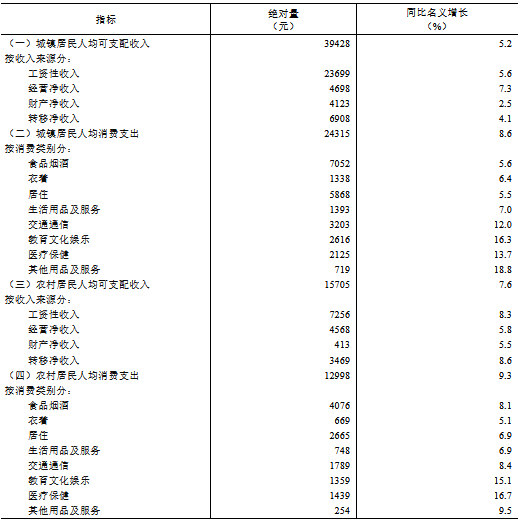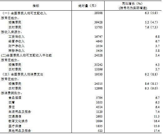 前三季度中國居民人均可支配收入29398元,同比名義增長6.3%香港新聞網10月18日電 國家統計局網站10月18日公佈2023年前三季度居民收入和消費支出情況。 一、居民收入情況 前三季度,全國居民人均可支配收入29398元,比上年同期名義增長6.3%,扣除價格因素,實際增長5.9%。分城鄉看,城鎮居民人均可支配收入39428元,增長(以下如無特別說明,均為同比名義增長)5.2%,扣除價格因素,實際增長4.7%;農村居民人均可支配收入15705元,增長7.6%,扣除價格因素,實際增長7.3%。 按收入來源分,前三季度,全國居民人均工資性收入16747元,增長6.8%,佔可支配收入的比重為57.0%;人均經營凈收入4643元,增長6.7%,佔可支配收入的比重為15.8%;人均財產凈收入2554元,增長3.7%,佔可支配收入的比重為8.7%;人均轉移凈收入5454元,增長5.8%,佔可支配收入的比重為18.6%。 前三季度,全國居民人均可支配收入中位數24528元,增長5.4%,中位數是平均數的83.4%。其中,城鎮居民人均可支配收入中位數35242元,增長4.3%,中位數是平均數的89.4%;農村居民人均可支配收入中位數13396元,增長5.7%,中位數是平均數的85.3%。 圖1 2023年前三季度全國及分城鄉居民人均可支配收入與增速